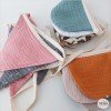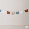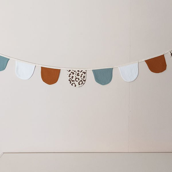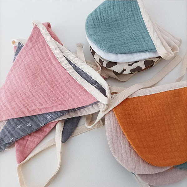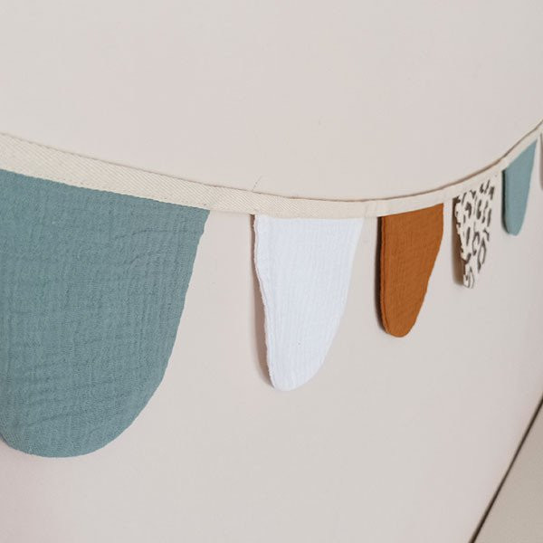 Garlanda de roba amb 9 banderins en forma de mitja lluna. L'opció perfecta per completar la decoració de les habitacions infantils, aportant dolçor i festivitat a l'ambient. Cadascun dels banderins està fabricat amb tela de mussolina de cotó orgànic.