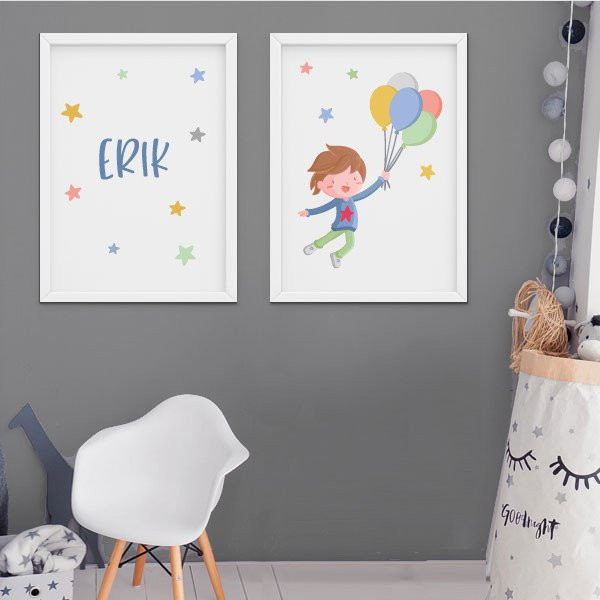 Alegres quadres decoratius amb un nen volant amb globus. Productes decoratius 100% personalitzables amb els que podràs decorar de manera exquisida les habitacions infantils.