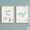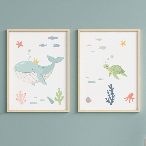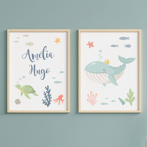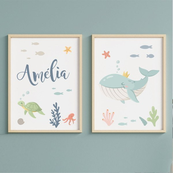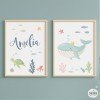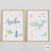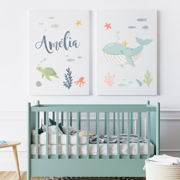 Conjunt de 2 làmines infantils amb la il·lustració d´una meravellosa balena reina. Productes de decoració infantil personalitzables amb el nom del nadó.
