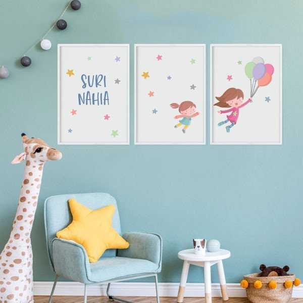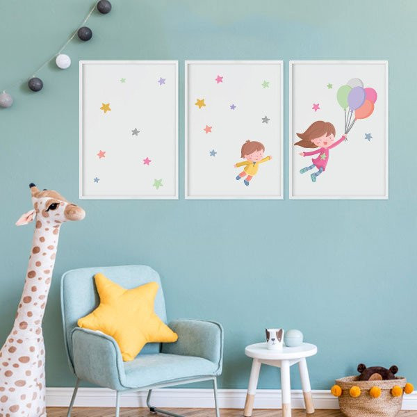Alegres quadres decoratius amb dues germanes volant amb globus. Una bona opció per decorar habitacions compartides i omplir de color i alegria les parets. El germà petit es pot triar si es vol nen o nena. Combina’l amb altres productes de la mateixa col·lecció!