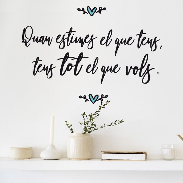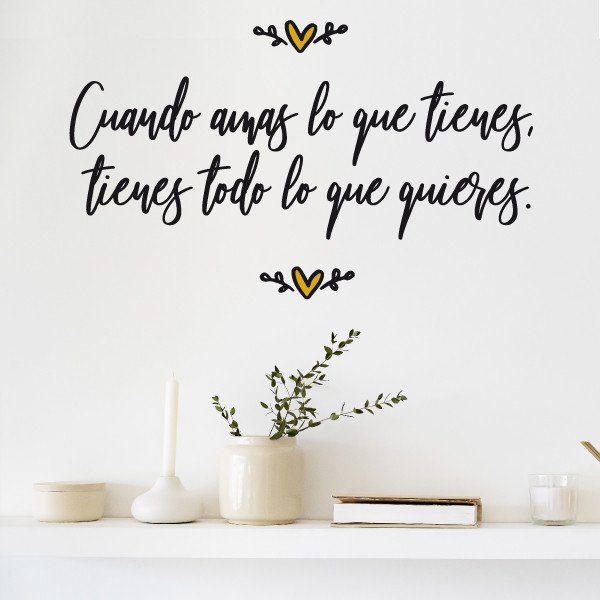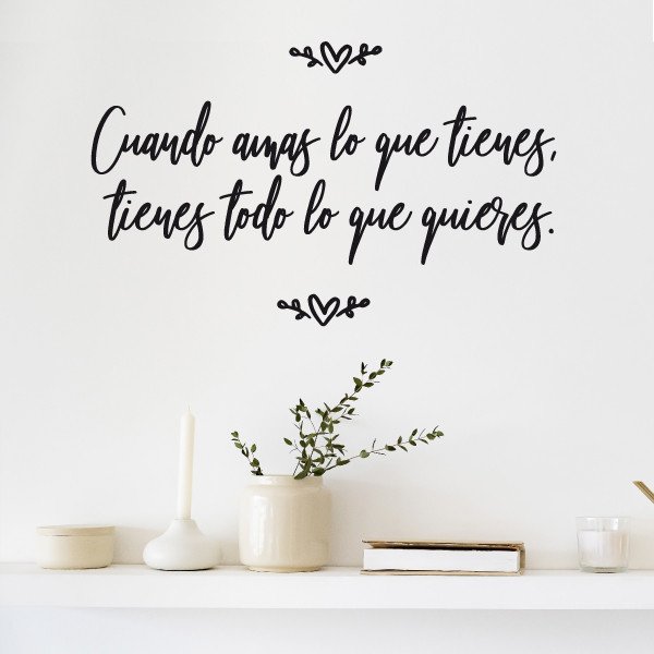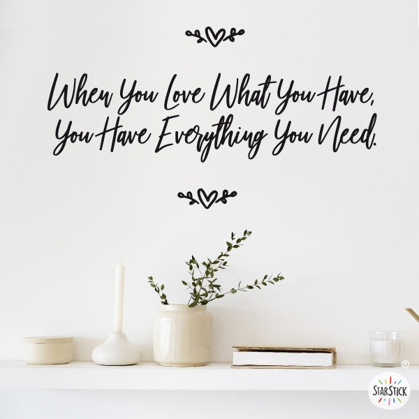 Vinil decoratiu de paret amb la frase "Quan estimes el que tens tens tot el que vols". Un vinil perfecte per decorar capçals de llit, menjadors, rebedors... La frase es pot adquirir en blanc o en negre, i si es vol, es poden seleccionar els cors de color. Decora la teva casa amb adhesius de paret de la marca StarStick; vinils de gran qualitat i dissenys encantadors.