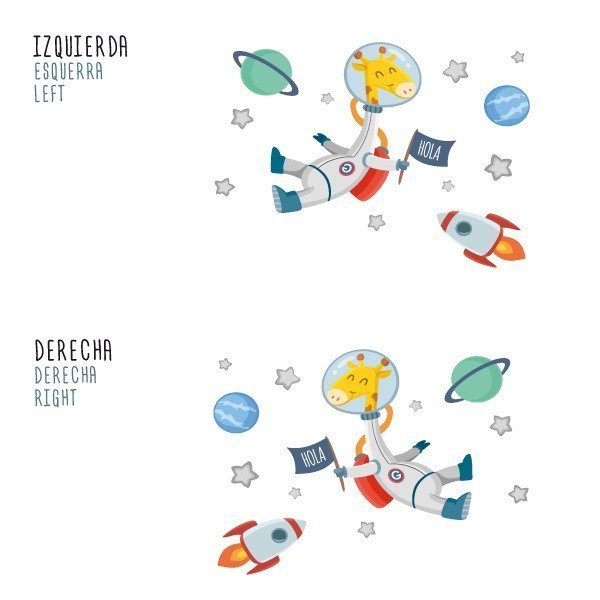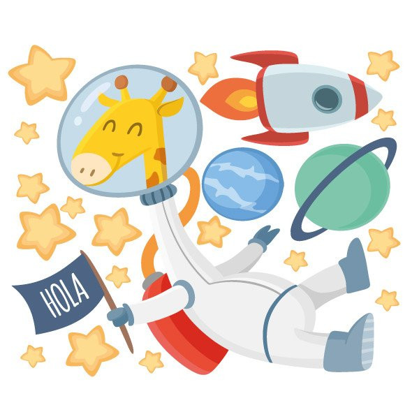 Original vinil infantil de girafa astronauta perfecte per decorar habitacions de nadons i nens amb un toc màgic i espacial. Una divertida girafa explorant l’univers, acompanyada d’estrelles i un petit coet, omplirà el dormitori de fantasia i imaginació.