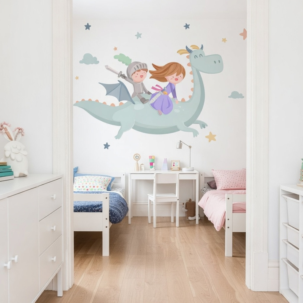 Meravellós vinil infantil amb un valent cavaller, una guerrera princesa i un ferotge drac, en una emocionant escena plena d'acció i aventura. Els nens podran submergir-se en un món màgic mentre decoren les habitacions compartides amb aquest sorprenent disseny. El detall i la qualitat daquest vinil són simplement sorprenents. El cavaller, la princesa i el drac estan acuradament il·lustrats en colors vibrants, creant una imatge captivadora que segurament capturarà la imaginació dels teus nens. Els núvols i els estels de colors afegeixen un toc d'encant i màgia a l'escena, creant una atmosfera màgica a l'habitació. Aquest vinil és perfecte per transformar la decoració de la cambra dels teus fills. Aventura't a canviar l'aspecte de la seva habitació i crea un ambient de fantasia i diversió. Els teus fills se sentiran emocionats i animats per tenir aquests valents personatges a les parets, i tu també podràs gaudir del seu estil i bon gust! StarStick, vinils únics.