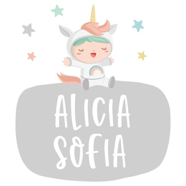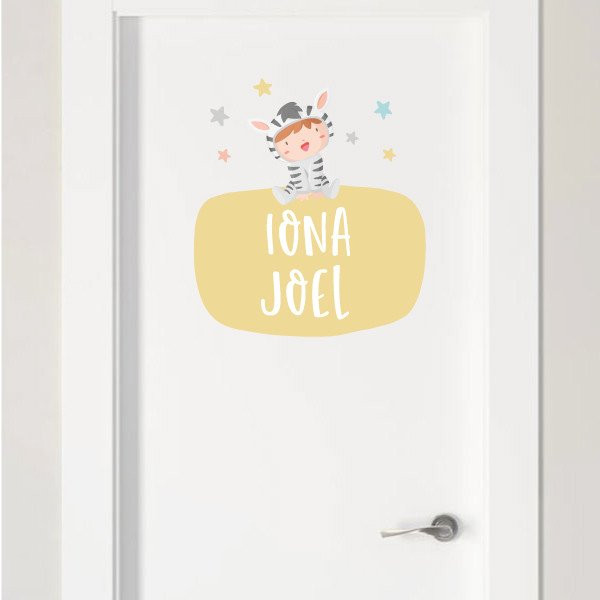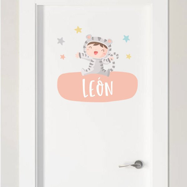 Vinils decoratius personalitzables amb un o dos noms. Tres models diferents per enganxar en portes, parets, mobles, capçals de llit ... Atreveix-te i decora de manera original i afectuosa la nova habitació del teu nadó. Omple-la de tendresa i alegria amb els divertits vinils de la col·lecció; nadons disfressats. Zebres, tigres, unicorns ...