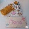 Personalized pack to give to a baby. Set for newborns with top quality handmade products and a natural wooden sign personalized with the baby's name. A perfect detail to welcome a family member or friend.
