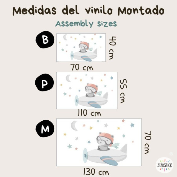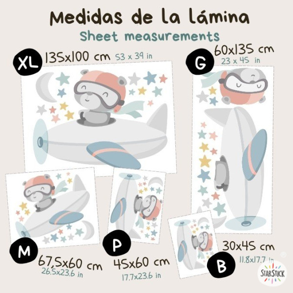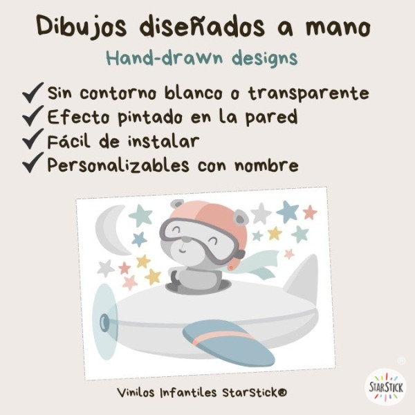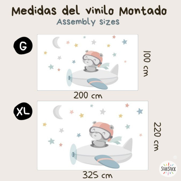 Here comes the pilot bear! This decorative baby wall sticker featuring a bear in an airplane in soft pastel tones is perfect for decorating nurseries with a sweet and delicate style. A charming design that brings warmth, tenderness and a dreamy touch to any children’s space.