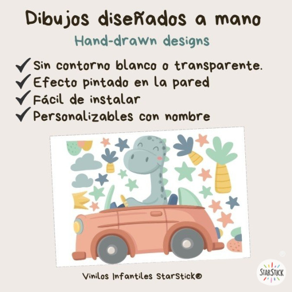 Fill your baby’s room with art and harmony using StarStick kids decorative wall stickers. Unique stickers, easy to install and with stunning results. This adorable design of a dinosaur riding in a car is absolutely charming. Available with the car in terracotta or turquoise blue, choose the one that best suits your style, personalise it with a name and make your walls unique, special and full of magic.