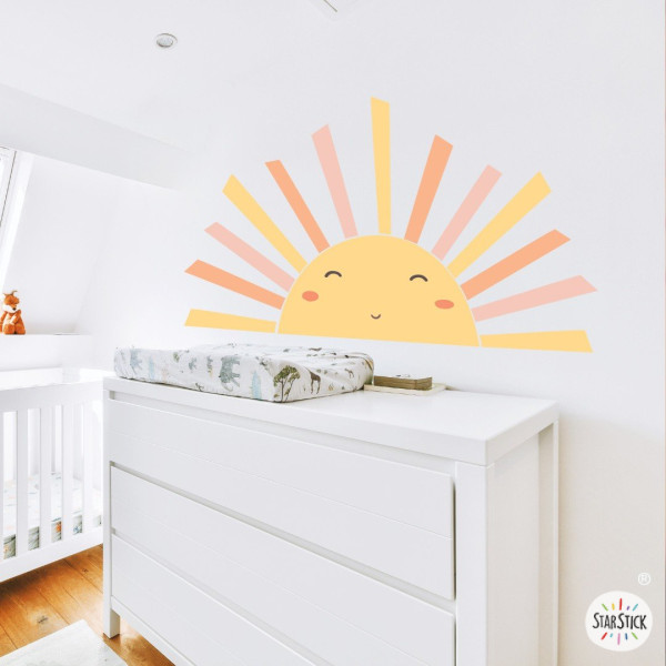 The Happy Sun wall decal transforms any baby nursery into a warm, welcoming and joyful space. Its smiling sun design creates a balanced focal point that enhances the emotional atmosphere of the room.