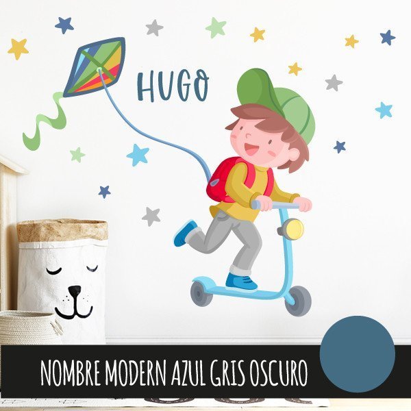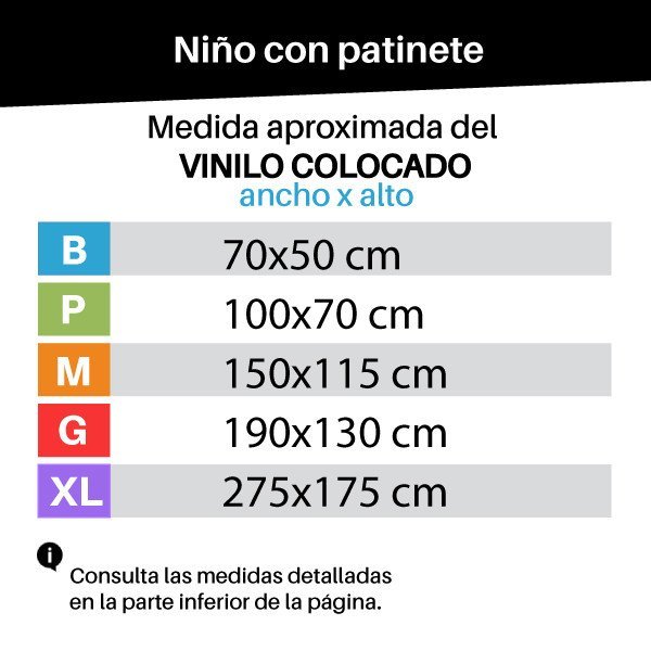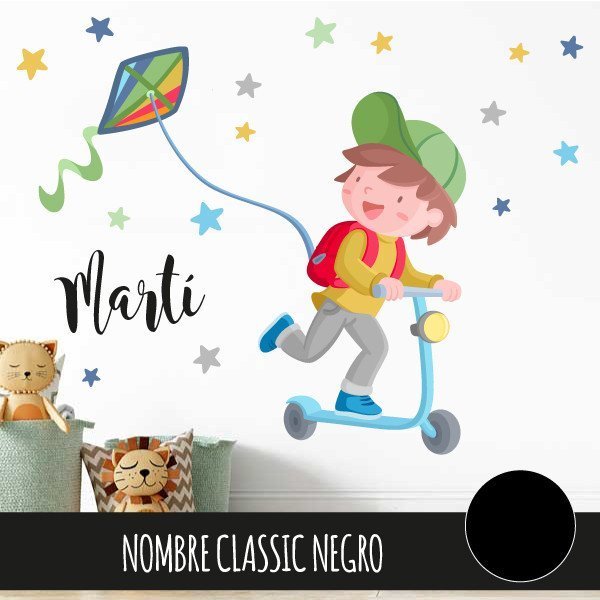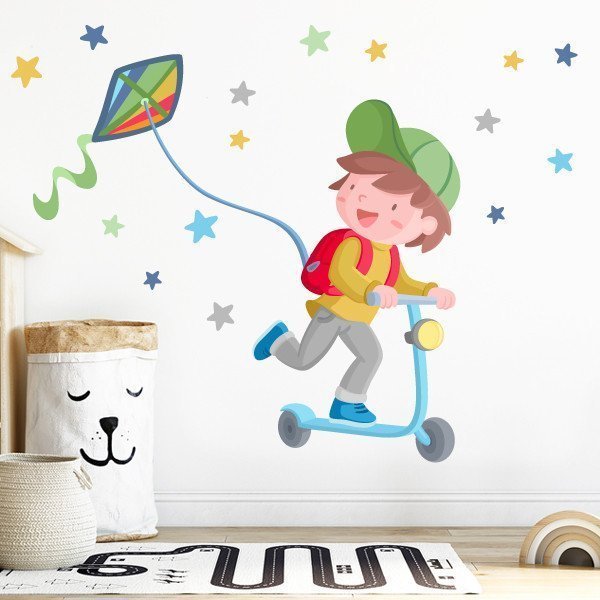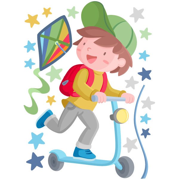Cheerful decorative vinyl with the illustration of a boy riding a scooter. Murals full of color, capable of making any wall shine, filling it with fun and personality. The mural includes the boy, the scooter, the kite and the stars. Advice! If you want to decorate a shared room, a school corridor or any shared children's space, we suggest you combine this model with the vinyl of the girl with a scooter. You will have a super TOP wall!