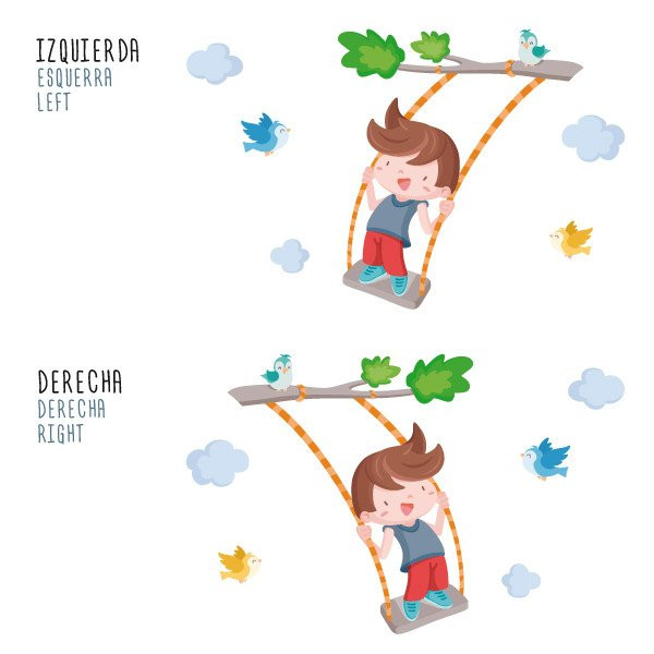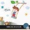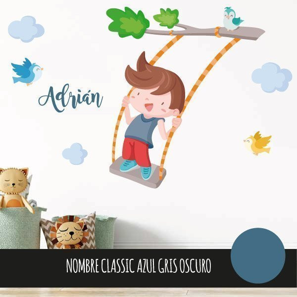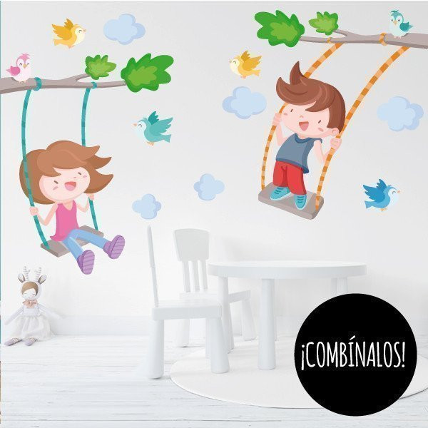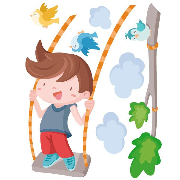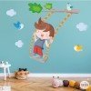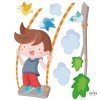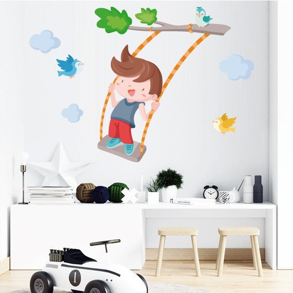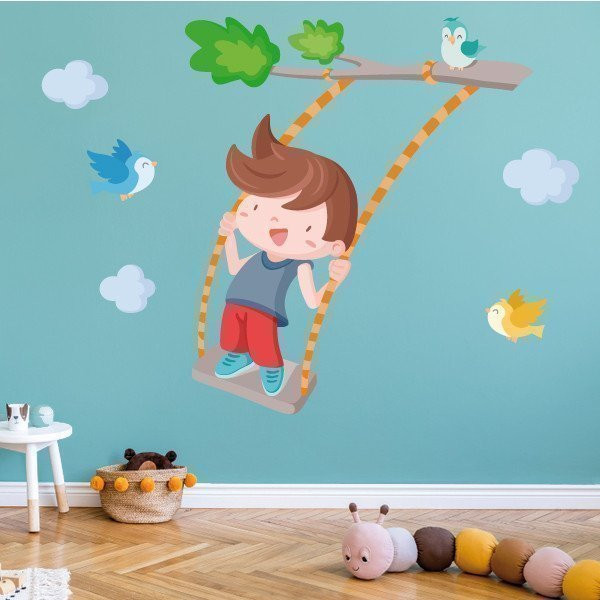 Cheerful wall sticker with a boy swinging on the tree branch. Decorative vinyl full of joy, color and fun. Murals to decorate children's rooms. StarStick brand design products.