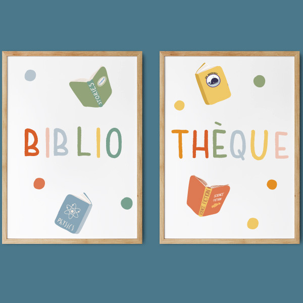 Set of 2 decorative prints featuring the word Library, designed in a Montessori style to create a harmonious and welcoming atmosphere. Customize them by choosing language, size, and finish, and transform your classroom or library into an inspiring space full of warmth and creativity.