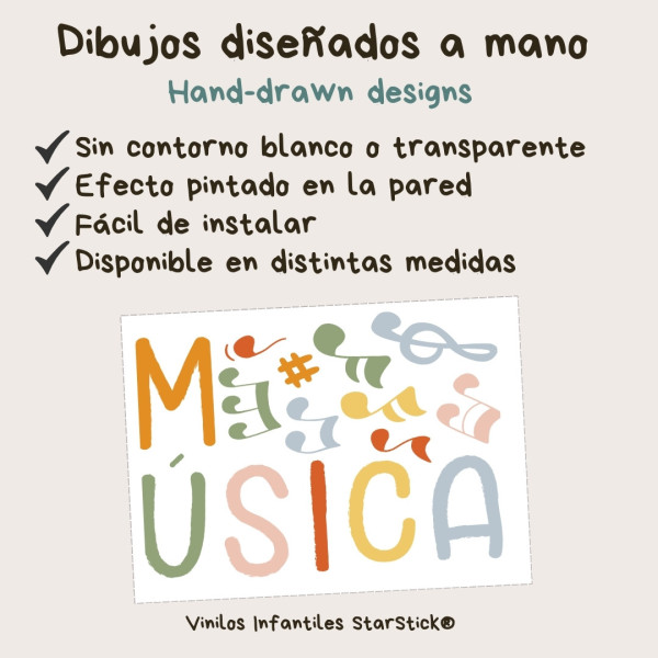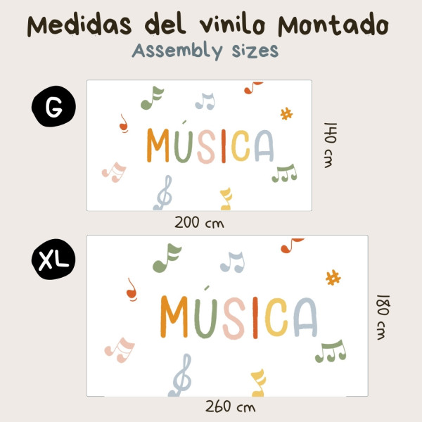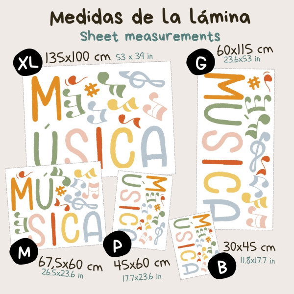 Decorative decal with the word "Music" accompanied by musical notes in a variety of colors. Personalize your space by choosing the size and language you prefer, creating a warm and harmonious mural decoration perfect for any environment.
