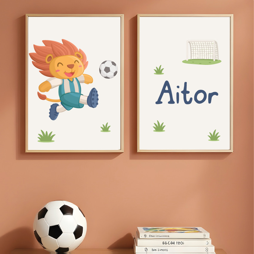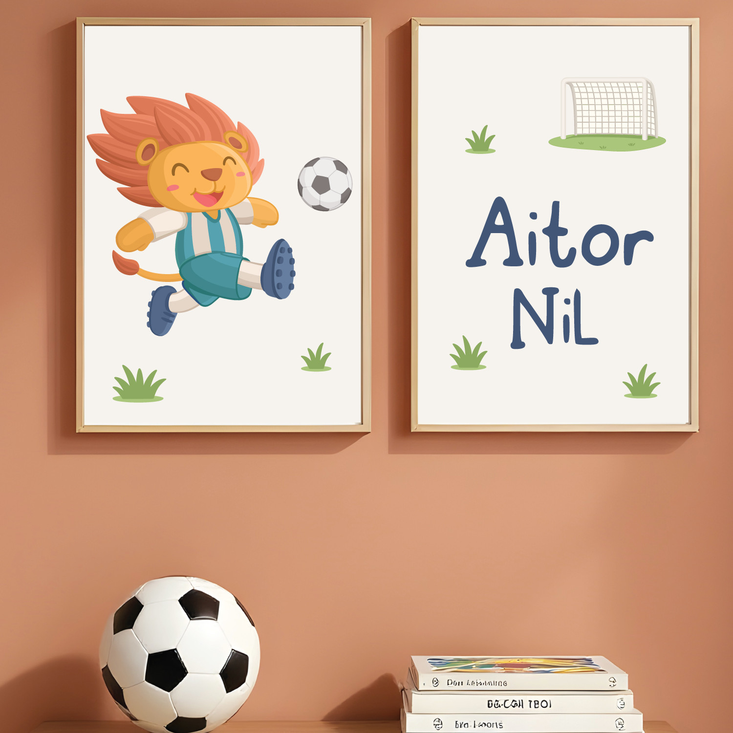 Set of 2 personalized kids’ wall prints | Footballer Lion