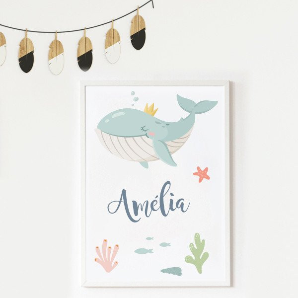 Children's print with the illustration of a wonderful queen whale. Children's decoration products customizable with the baby's name.