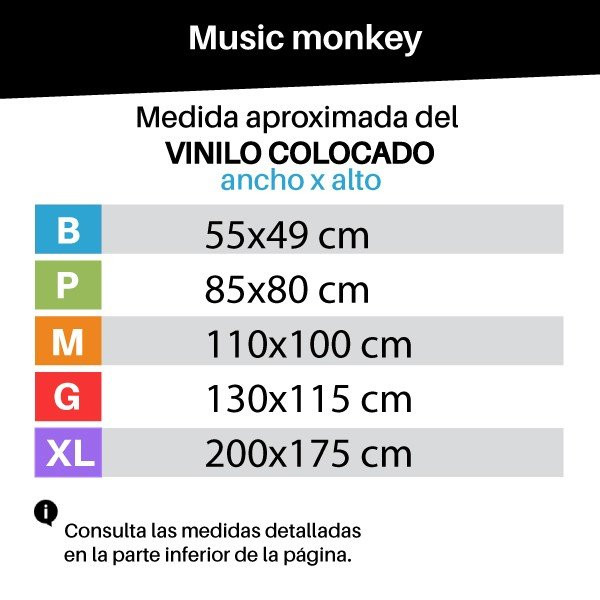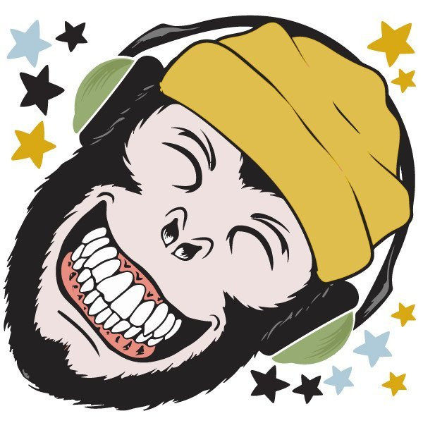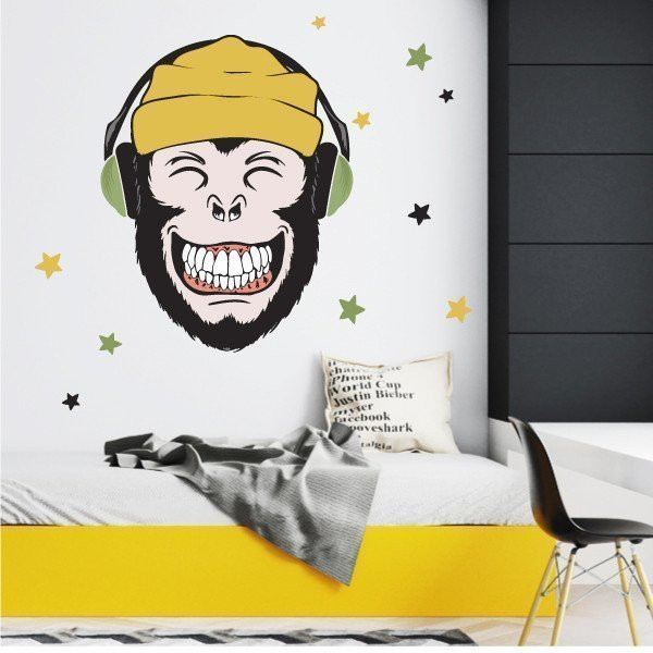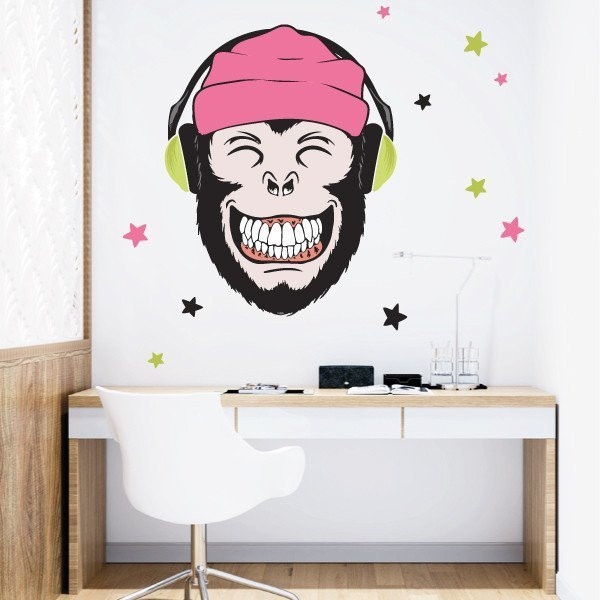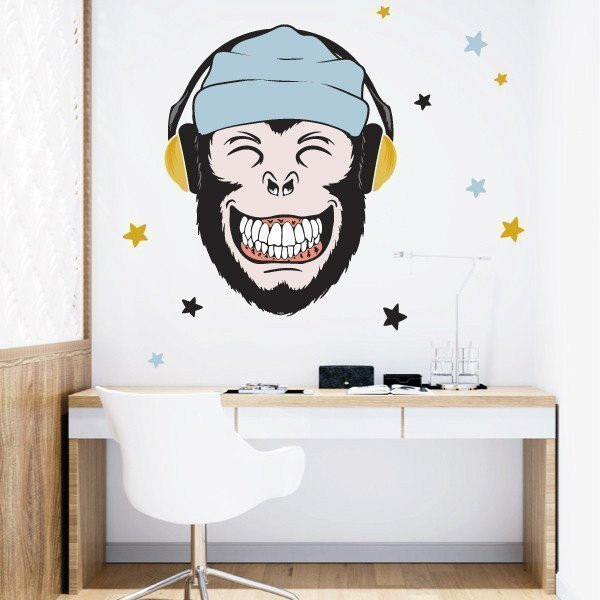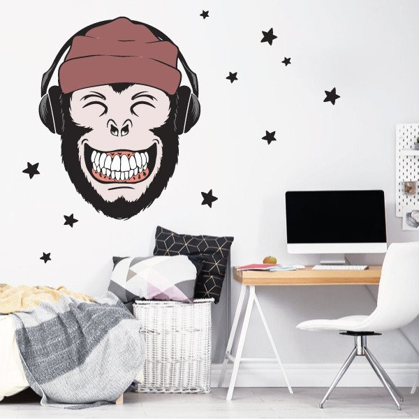 Decorative vinyl with a spectacular monkey with headphones. Wall stickers designed to decorate the rooms of daring young people, full of personality and with a great sense of humor. Decorative ideas with groundbreaking designs that give an original and fun air to any youth room. Choose colors, size and start redecorating your space now.
