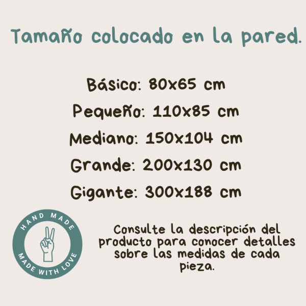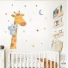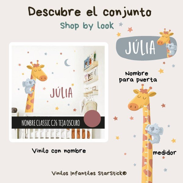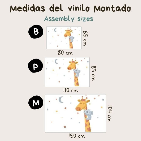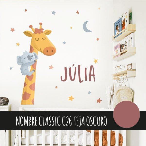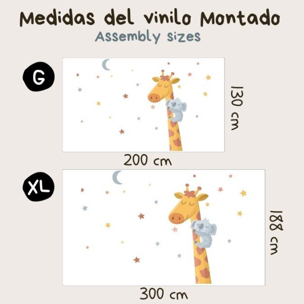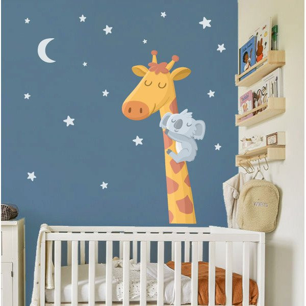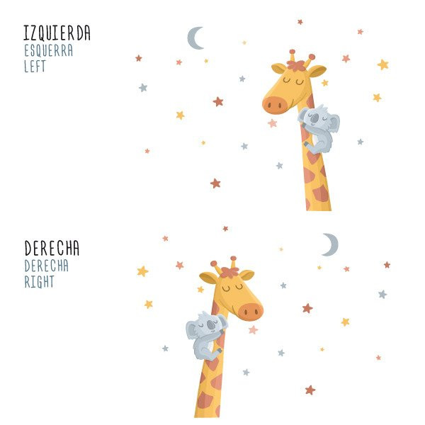 Beautiful wall decal with an elegant giraffe walking a koala. Stickers full of sweetness and originality to decorate children’s rooms. There are two versions of the same vinyl, with the gray moon and the stars in earth tones, or with the moon and white stars. Choose the option that best suits your baby’s new space.