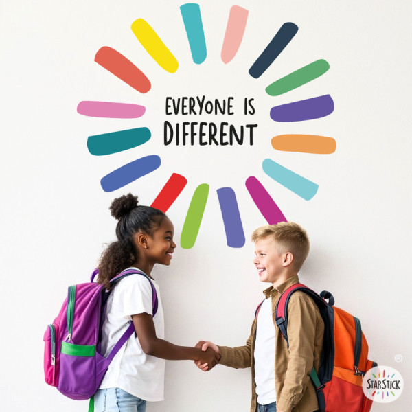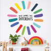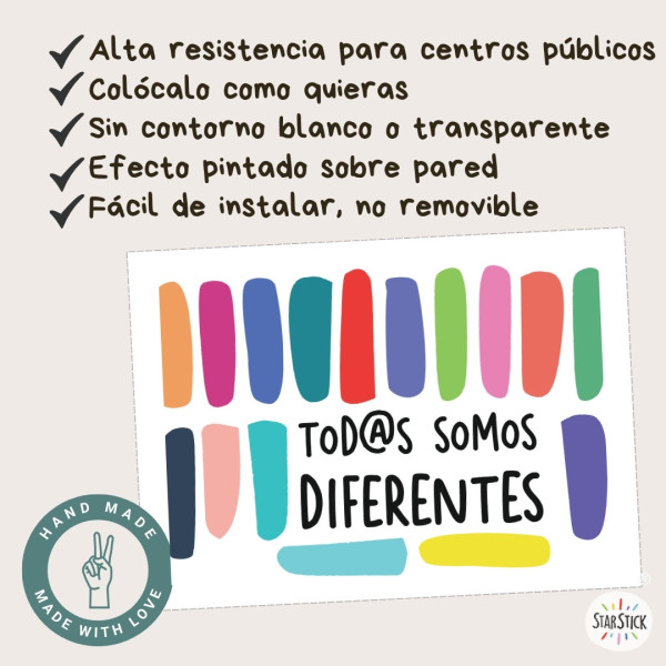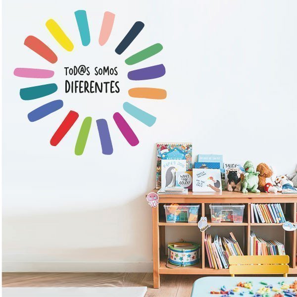 Extraordinary wall stickers to decorate educational centers or public spaces. High quality vinyl, customizable in different sizes and languages and very easy to install. Perfect for decorating the walls, creating pleasant, elegant environments and promoting the values of equality and diversity. Each piece is independent, they can be glued together creating the composition that each one prefers. We are all different.
