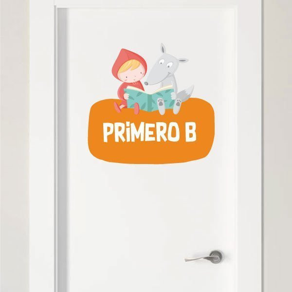 Cartel señalizador con la caperucita roja y el lobo. Se puede pegar en paredes, puertas, cristales, muebles… Vinilos infantiles que permiten señalizar y decorar a la misma vez.