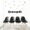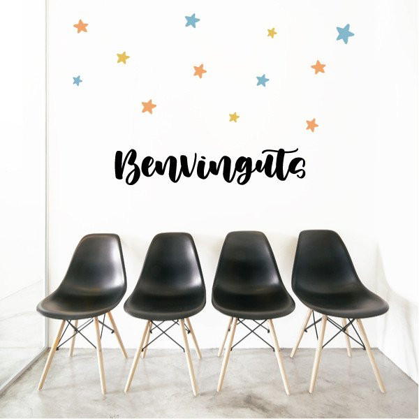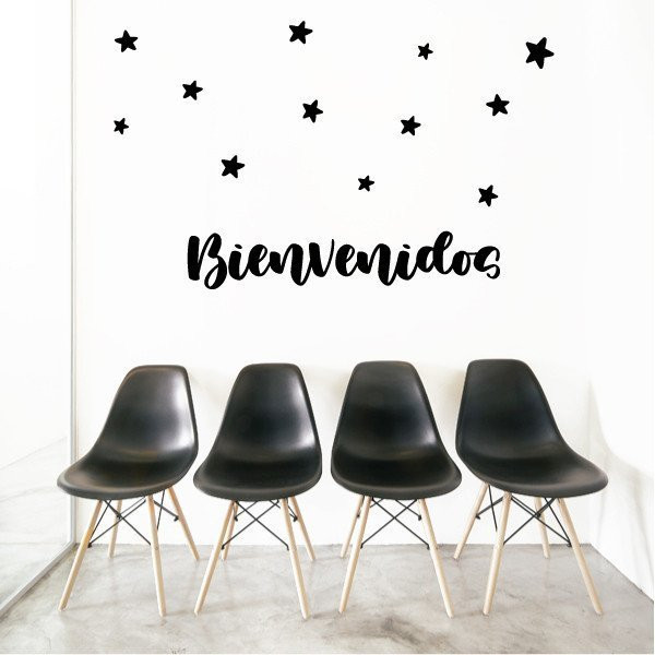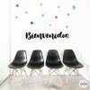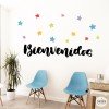Vinilo mural con la palabra Bienvenidos y estrellas de colores. Vinilos de gran calidad para decorar de manera original y divertida todo tipo de espacios. Cada elemento es independiente, se puede pegar con la composición que cada uno prefiera, creando un mural 100% personalizado.