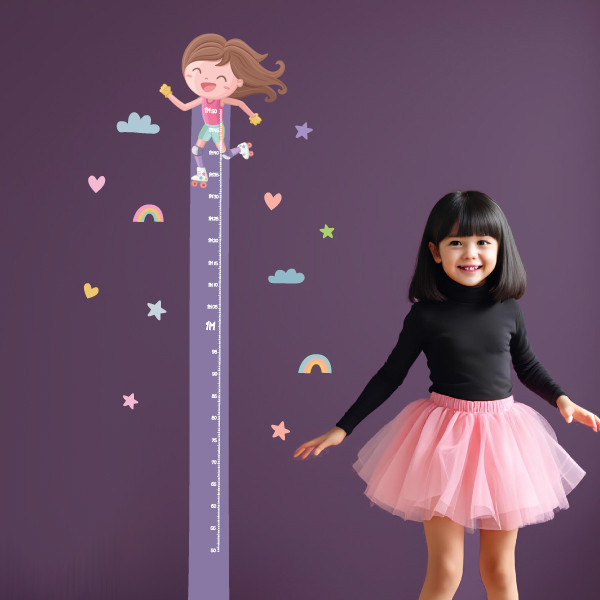 ¡Mide su crecimiento con estilo! Diseñado con una encantadora niña patinadora, este medidor de altura no solo es funcional, sino que también aporta un toque original y divertido a la decoración. Fabricado en vinilo de alta calidad, es muy fácil de colocar. Ideal para niñas llenas de energía y pasión por el deporte. ¡Porque crecer también puede ser una aventura llena de estilo!