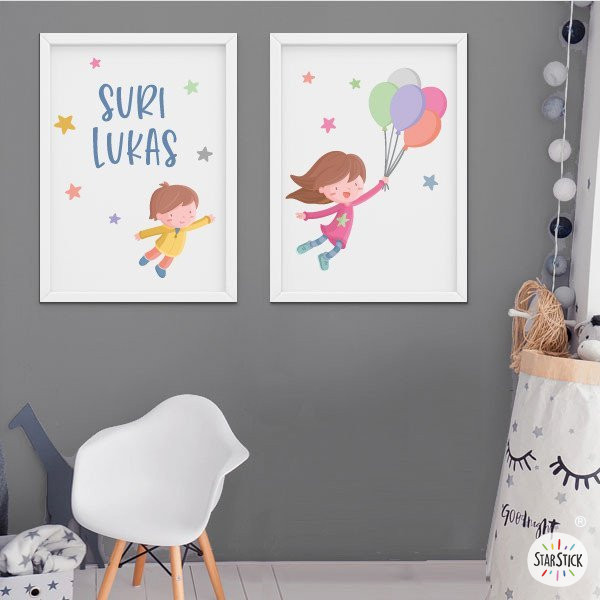 2 cuadros infantiles personalizables - Hermanos con globos