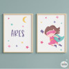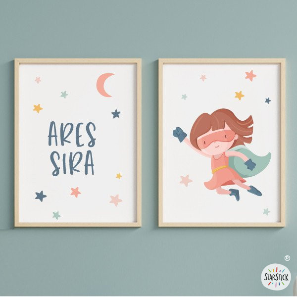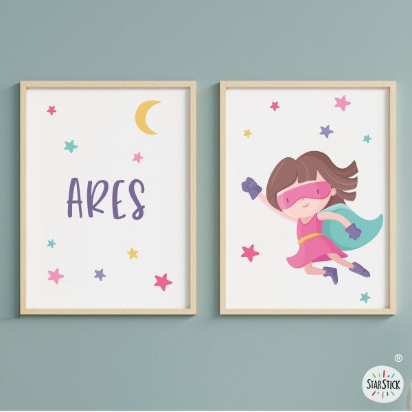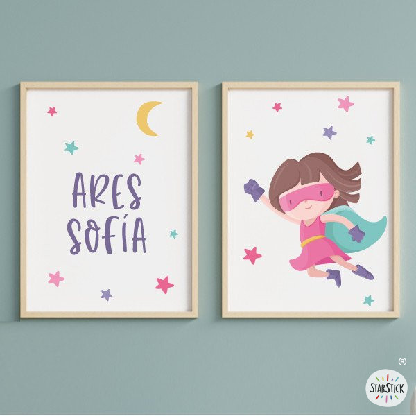 Espectaculares láminas para enmarcar con la ilustración de una niña superheroína. Una genial propuesta para decorar las habitaciones de todas las niñas amantes de las superheroinas, las aventuras fantásticas y las historias llenas de intriga. Personalízalas con uno o dos nombres y combínalas con otros productos de la misma colección para conseguir una decoración súper especial.