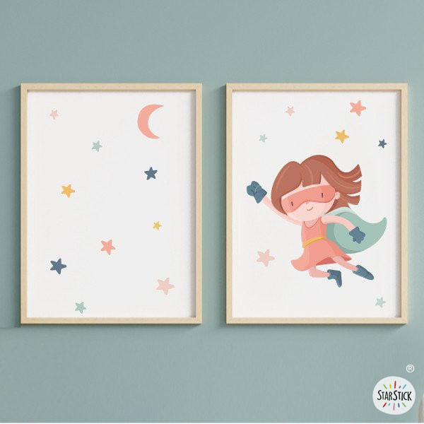 Espectaculares láminas para enmarcar con la ilustración de una niña superheroína.