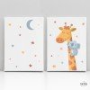 Pack con dos Láminas infantiles de cuadro personalizadas con la ilustración de una elegante jirafa paseando un koala.