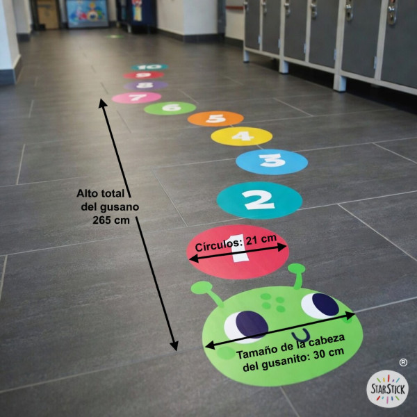 Gusano de vinilo para suelo infantil, ideal como juego educativo para saltar y desarrollar la motricidad. Perfecto para escuelas, aulas y espacios interiores, este vinilo adhesivo convierte el suelo en una zona de aprendizaje activa, divertida y dinámica.