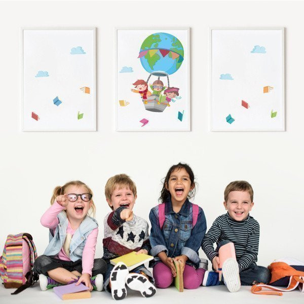 Sorprendentes láminas infantiles con un globo aerostático en forma de tierra. Un maravilloso viaje por el mundo de los libros. Perfecta para llenar de ilusión, alegría y pasión por la lectura cualquier espacio infantil; habitaciones, salas de juego, bibliotecas, aulas…