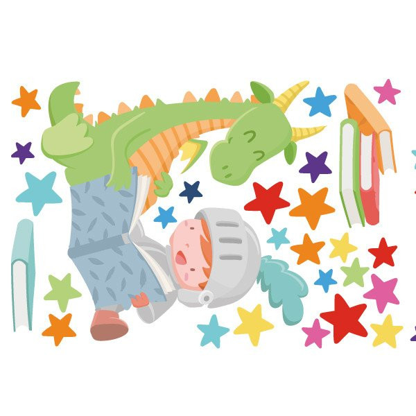 Convierte cualquier espacio en un rincón mágico con este vinilo infantil de dragón y caballero leyendo. Una ilustración encantadora que inspira la imaginación y fomenta el amor por la lectura.