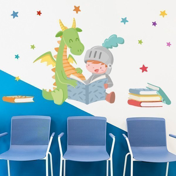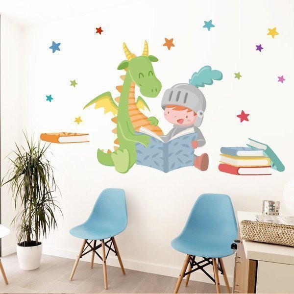 Vinilo infantil dragón y caballero leyendo: magia y aprendizaje