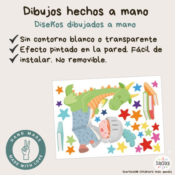 Este vinilo decorativo infantil con dragón y caballero leyendo un cuento es una pieza única que transforma cualquier espacio en un entorno lleno de fantasía. Su diseño exclusivo de StarStick crea una atmósfera acogedora ideal para fomentar la lectura y la imaginación.