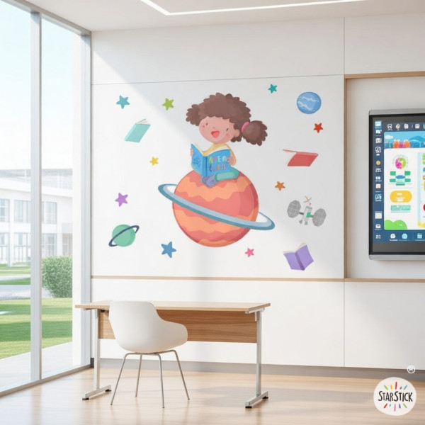 Vinilo educativo niña leyendo sobre un planeta para bibliotecas y espacios escolares