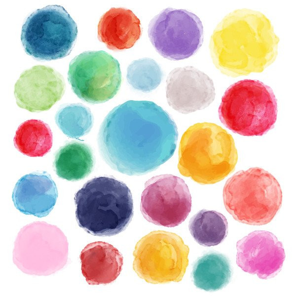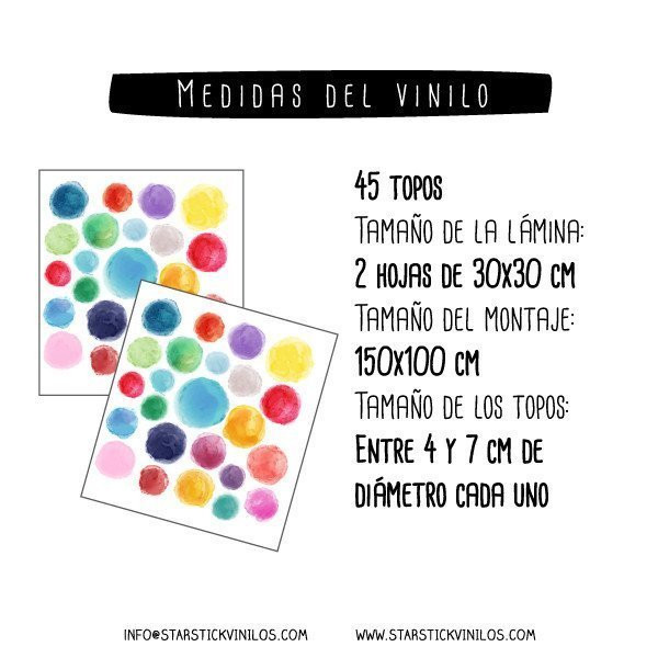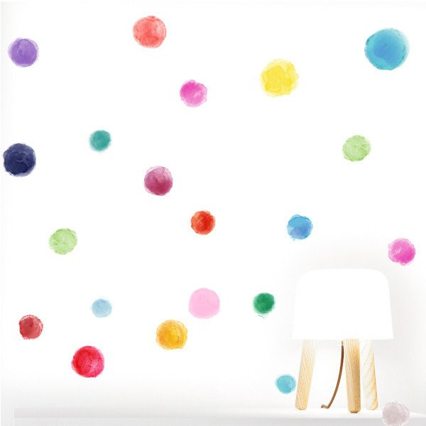 Confetis de colores efecto acuarela. Maravillosos, súper decorativos, luminosos y muy fáciles de instalar. El pack consta de 45 topos de diferentes tamaños. Pégalos a tu aire y llena tu hogar de diversión y color.