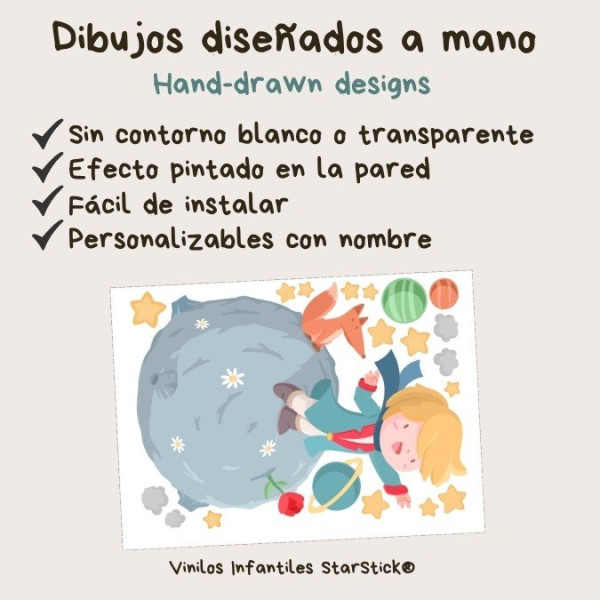 Tenemos un vinil infantil decorativo para bebé y niño con el Pequeño príncipe en su planeta, perfecto para decorar las habitaciones de los niños y bebés con ternura y felicidad. "Todas las personas mayores fueron al principio niños. (Aunque pocas de ellas lo recuerdan.)" Haz que tu pequeño nunca olvide su infancia con este hermoso vinil decorativo del Pequeño príncipe.
