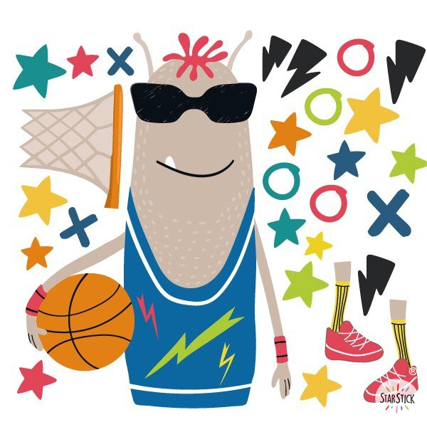Vinilo decorativo ideal para renovar las habitaciones infantiles. Este pack incluye al monstruo amante del básquet, la canasta y diversos símbolos de diferentes colores para expandir el mural.