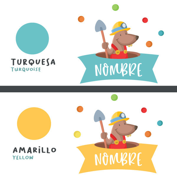 Vinilo personalizado ideal para colocar en puertas, paredes o muebles, creando un ambiente único y lleno de diversión. Este modelo del topo excavador es perfecto para combinar con el vinilo mural de la excavadora con animales. Disponible en amarillo y turquesa, y personalizable con uno o dos nombres.