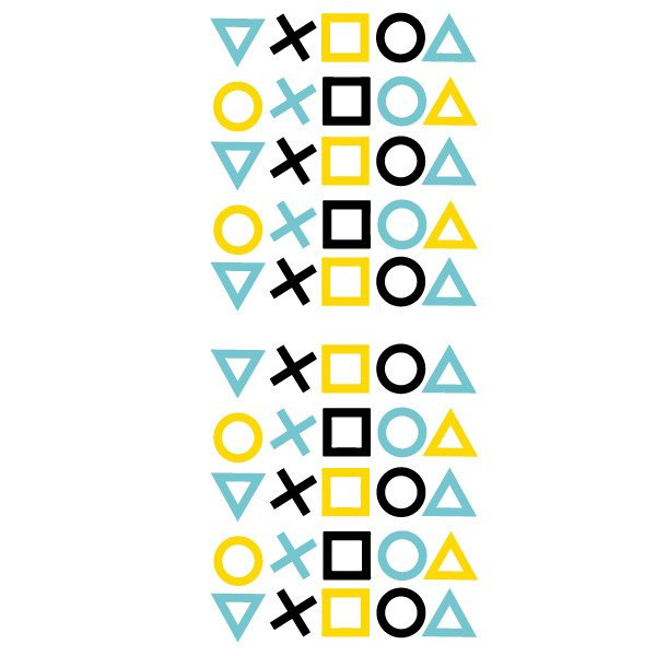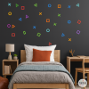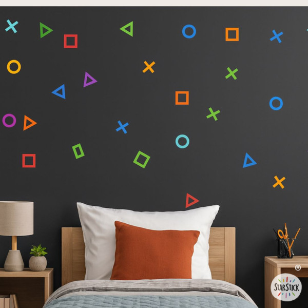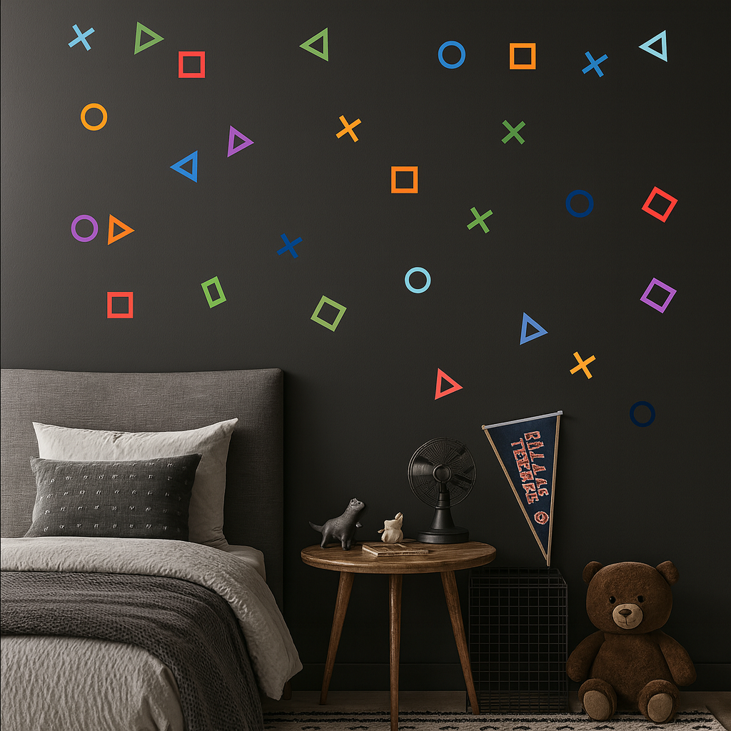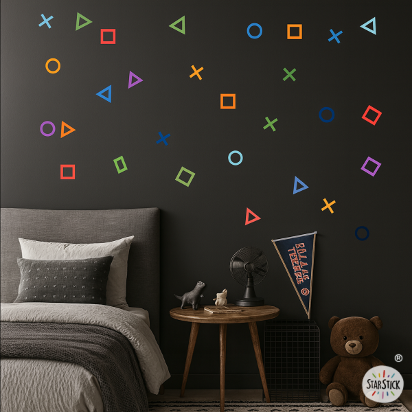 Autocollant décoratif de jeu vidéo pour adolescents avec des triangles, des cercles, des carrés et des croix. Parfait pour les amateurs de Play et de jeux vidéo. Un vinyle de jeu vidéo plein de couleurs pour décorer les chambres des garçons et des filles.