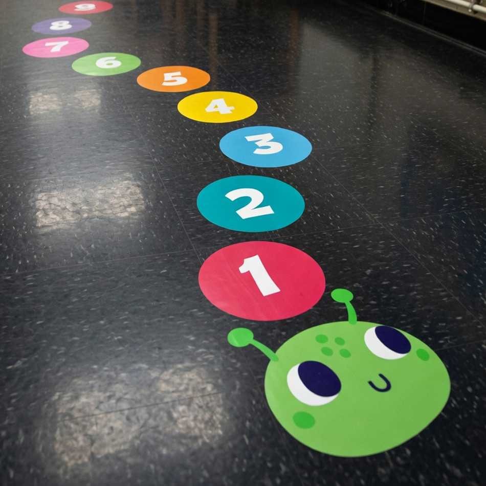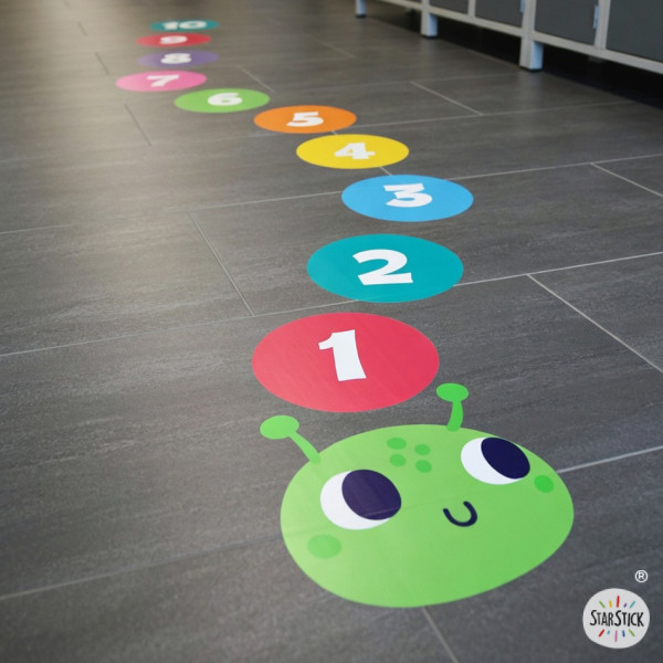 Personnaliser votre sticker avec un prénomJeu de sol vinyle pour enfants : chenille avec chiffres de 1 à 10 pour circuits de motricité et psychomotricité dans un couloir d'école. Autocollant décoratif antidérapant sur sol gris foncé.