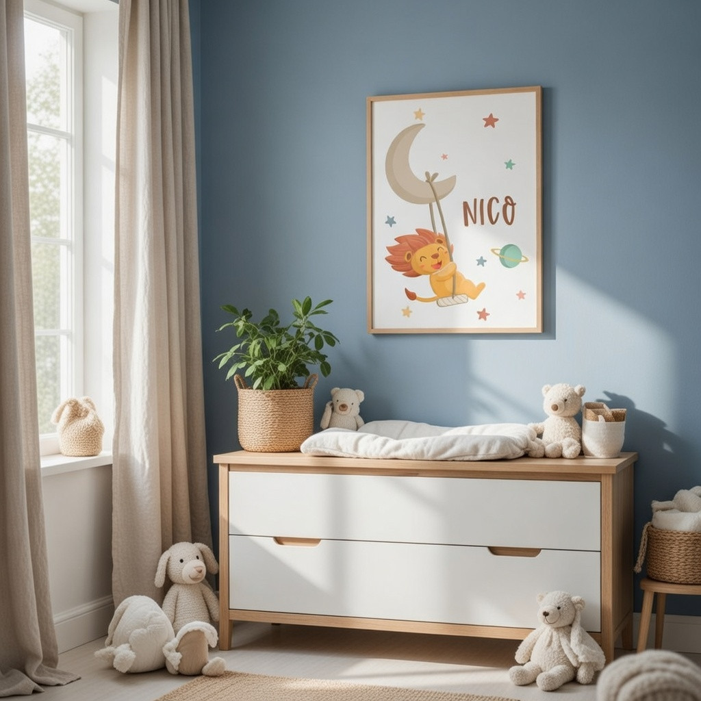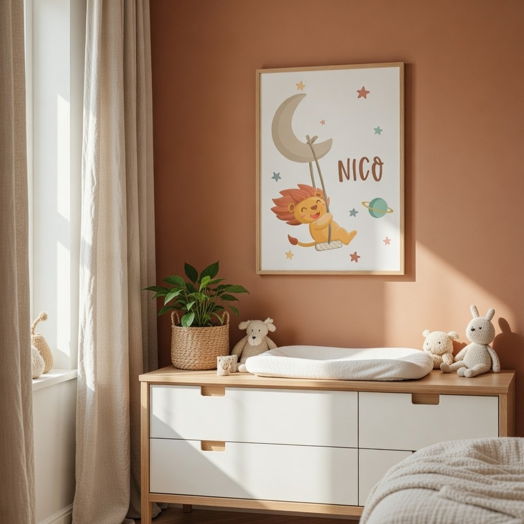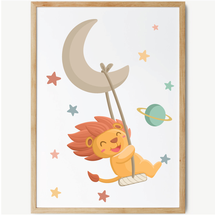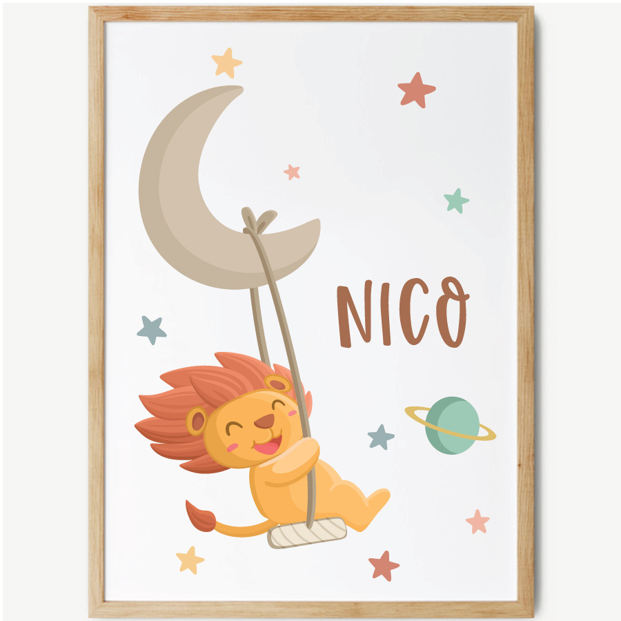 Tableau enfant personnalisé avec prénom, au design de lion sur la lune avec balançoire. Une affiche décorative originale et exclusive pour la chambre de bébé, parfaite pour créer une ambiance douce, chaleureuse et personnalisée dans les chambres d’enfants ou de nouveau-né.