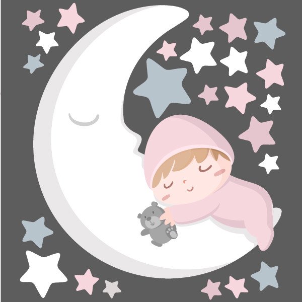 Remplissez la nouvelle chambre de bébé d'amour et de douceur avec ce fantastique vinyle pour enfants. Magnifique illustration d'un bébé qui dort sur la lune. Le pack comprend la lune avec le bébé, les nuages et les étoiles. Chaque silhouette est indépendante, vous pouvez créer la murale qui convient le mieux à l'espace dont vous disposez.