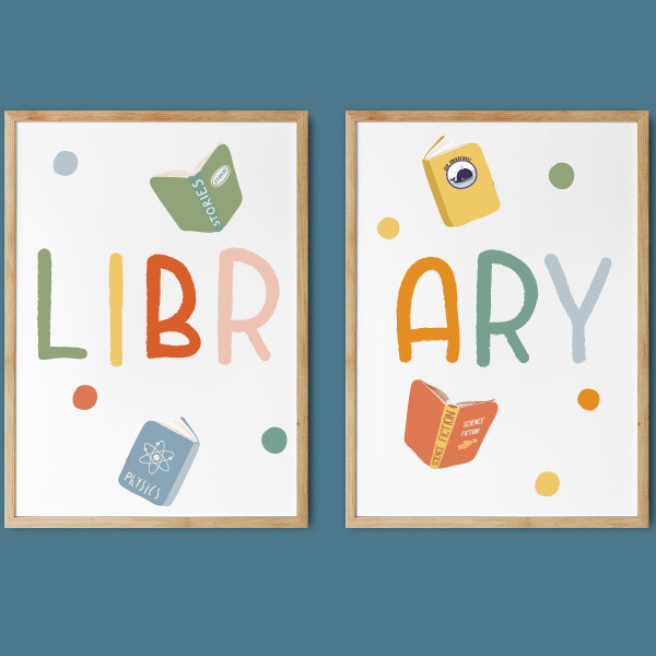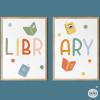 Ensemble de 2 affiches décoratives avec le mot Bibliothèque, conçues dans un style Montessori pour créer une atmosphère harmonieuse et chaleureuse. Personnalisez-les en choisissant la langue, la taille et la finition, et transformez votre classe ou bibliothèque en un espace inspirant, empreint de chaleur et de créativité.