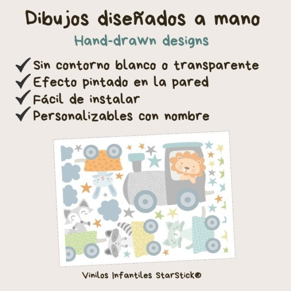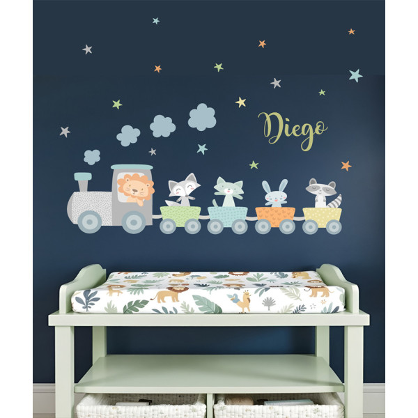 Personnaliser votre sticker avec un prénomCe sticker décoratif enfant représente un joyeux train rempli d’animaux adorables, conçu pour transformer la chambre de bébé en un espace coloré, tendre et amusant. Une proposition idéale pour chambres d’enfants, crèches ou espaces de jeu recherchant une ambiance stimulante et chaleureuse.