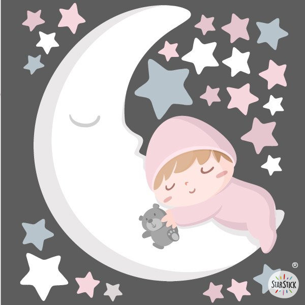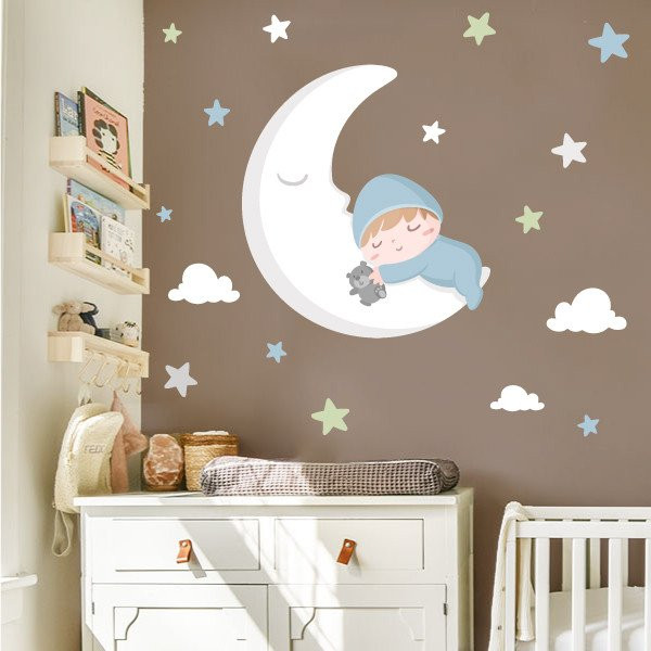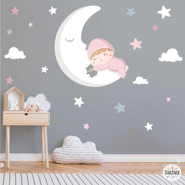 Remplissez la nouvelle chambre de bébé d’amour et de douceur avec ce magnifique sticker mural enfant. Une adorable illustration d’un bébé dormant sur la lune qui transforme le mur en un espace chaleureux et apaisant. Le pack comprend la lune avec le bébé, des nuages et des étoiles indépendantes pour créer une composition personnalisée adaptée à votre espace.