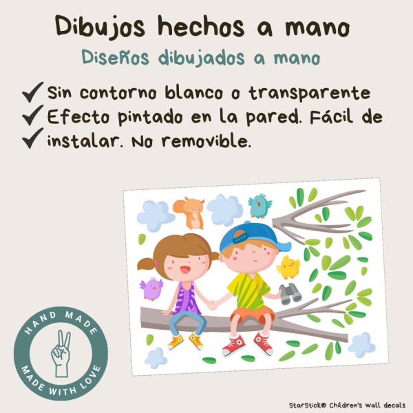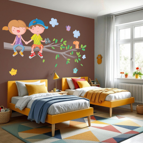 Personnaliser votre sticker avec un prénomCe charmant sticker mural décoratif montre un garçon et une fille assis sur une branche d’arbre entourés de feuilles, de nuages, d’oiseaux et de petits animaux. Une scène pleine de douceur et d’amitié qui transforme n’importe quel mur en une fresque décorative pleine de vie.