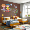 Sticker mural enfant représentant un garçon et une fille assis sur une branche d’arbre, entourés de feuilles, nuages, oiseaux et petits animaux. Une décoration murale pleine de douceur et d’harmonie, idéale pour les chambres d’enfants, crèches, salles de jeux ou écoles.