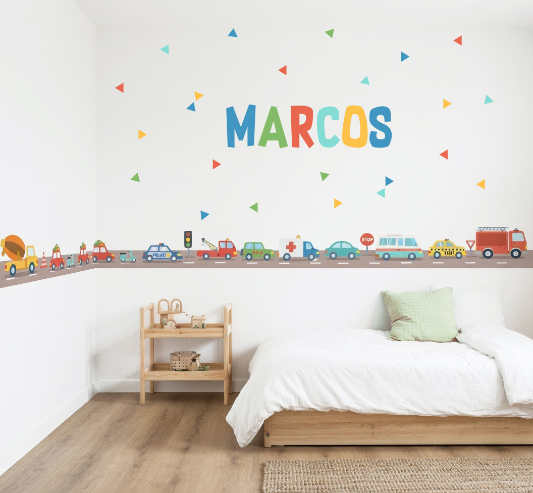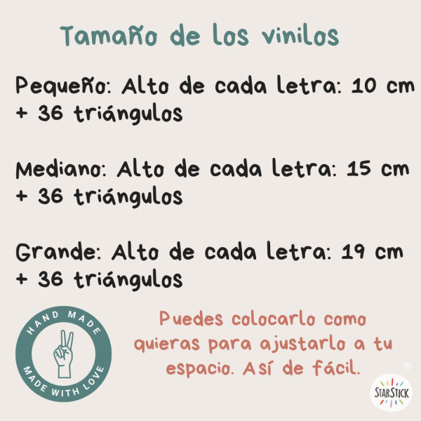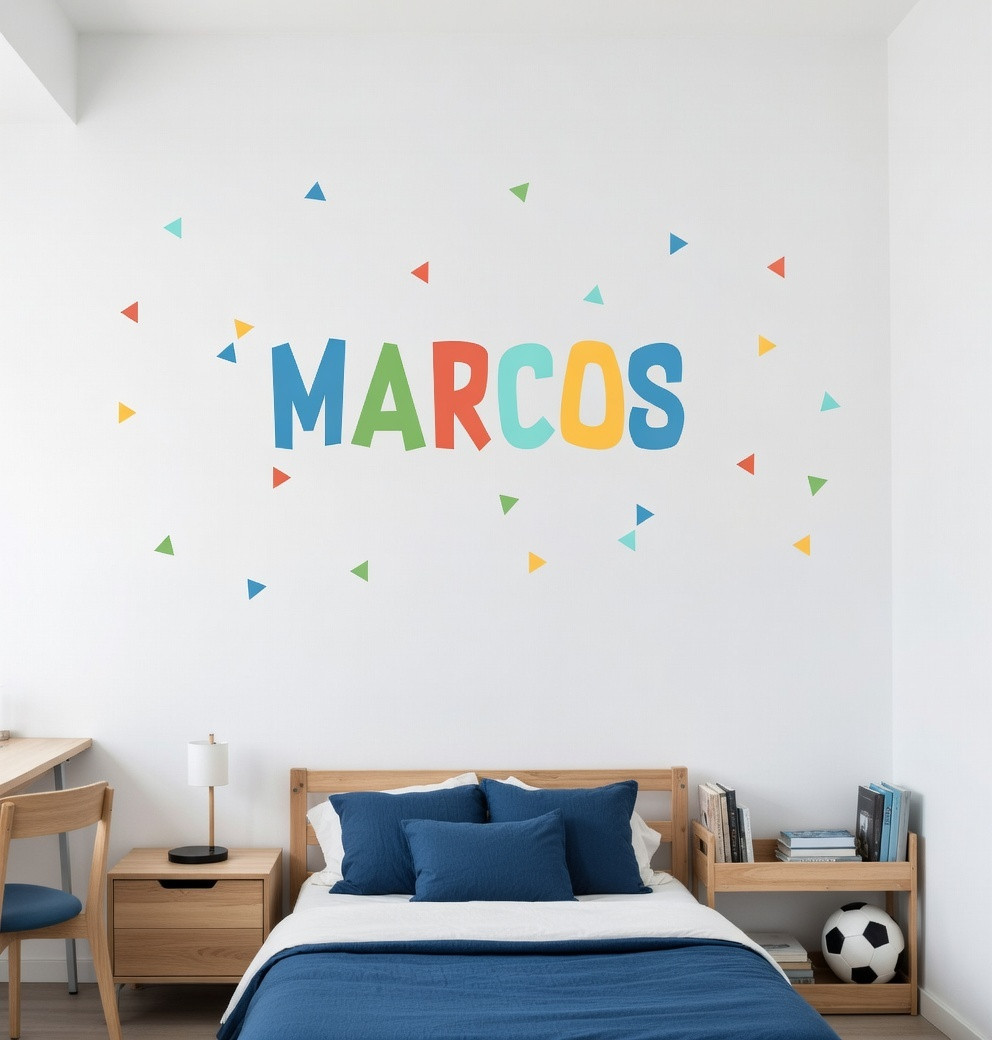 Sticker mural personnalisé avec prénom et triangles colorés, idéal pour les chambres d’enfants avec une touche originale, ludique et pleine de couleur. Chaque lettre et triangle est indépendant, ce qui permet de les placer librement et de créer la composition que vous souhaitez. Facile à poser et totalement personnalisable.